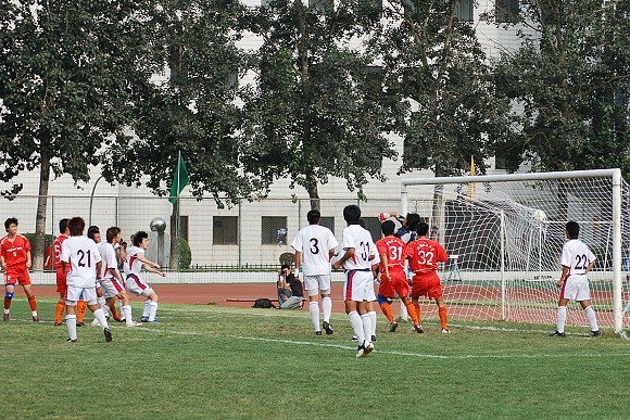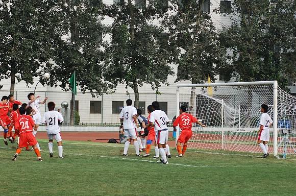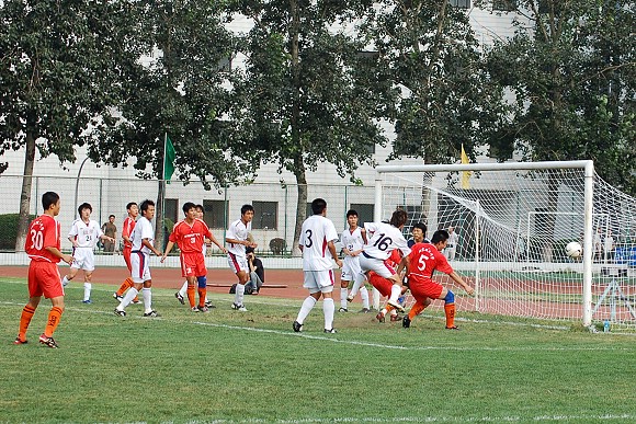 比較剛剛進(jìn)行到第5分鐘,我方球員在對(duì)方禁區(qū)內(nèi)爭(zhēng)頂。