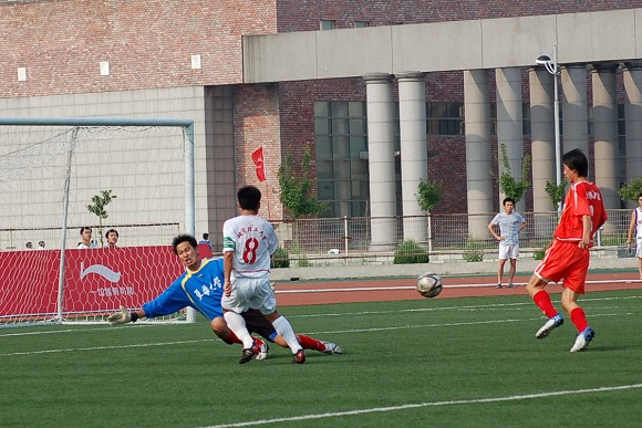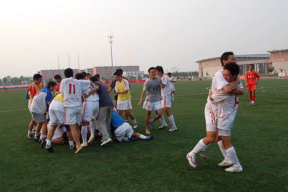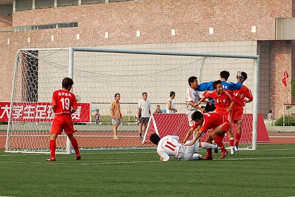 在緊張而又激烈的點球大戰中,我校足球隊率先罰球,且五射五中,而東華大學足球隊雖也三罰三中,但在罰第四輪點球時,罰球隊員高度緊張,猶豫不決,射出點球低平偏正且力道不足,我方守門員王毅判斷準確將球撲出,對方的第五輪罰球已無必要。最終我校足球隊以總比分6:4力克勁敵東華大學,從而在重新奪回大學生足球聯賽冠軍的道路上掃平了一個重要障礙。