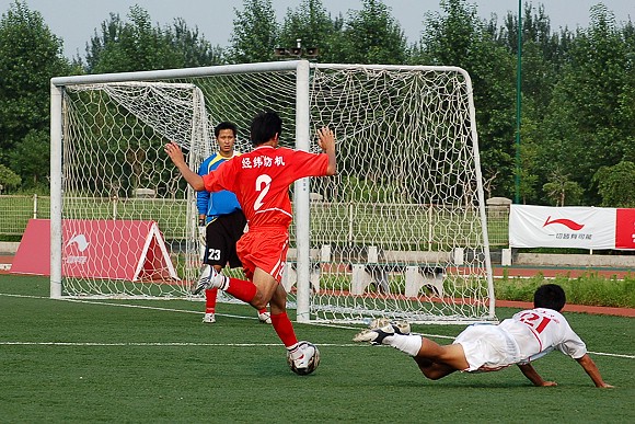 直到上半場第40分鐘,我方11號王強助攻傳球給8號隊長袁微,袁微在禁區前沿撥腳怒射,皮球從對方守門員的身下滾入網底,場上比分變為1:0。