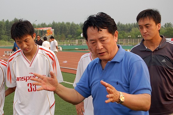 中場休息時,總教練金志揚在向隊員們做戰術指導,勉勵隊員一定要敢打敢拼,爭取把勝利保持到最后時刻。