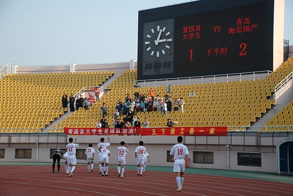 經過90多分鐘的頑強拼搏,愛國者大學生隊以1比2惜敗青島海利豐,但是整場比賽所表現出的團隊精神和永不服輸的精神,面對中甲勁旅,他們雖敗尤榮。比賽結束之后,愛國者大學生全體隊員,向為他們助威的青島理工大學的學生和愛國者助威團鞠躬感謝,同學們給予他們熱烈的掌聲,為他們不斷拼搏的精神喝彩。