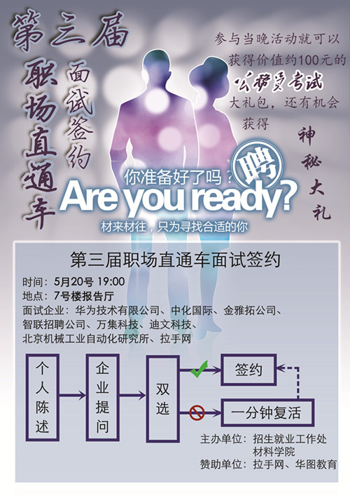 “職場直通車”是材料學院和招生就業工作處共同主辦的求職類活動,選手可以通過現場面試和企業現場簽署實習協議,邁出職場第一步。本屆職場直通車為所有到場觀眾準備了價值100元的公務員考試大禮包,同時還有機會獲得神秘禮品!歡迎全校同學積極參與!
