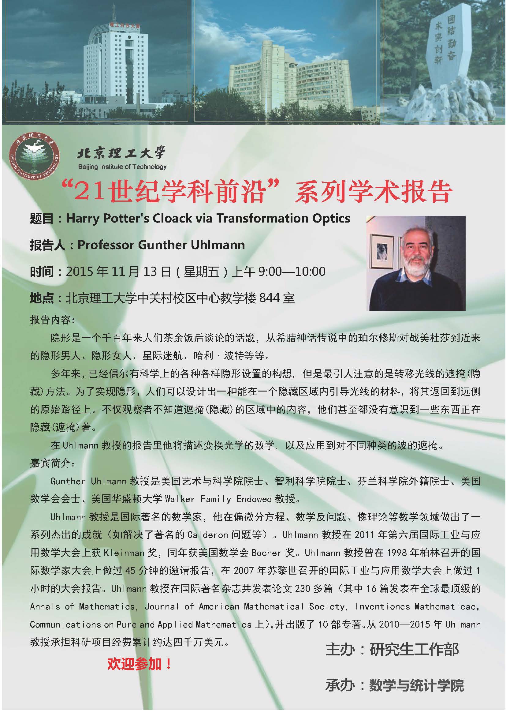 【數學學院】“21世紀學科前沿”Gunther Uhlmann教授學術報告通知