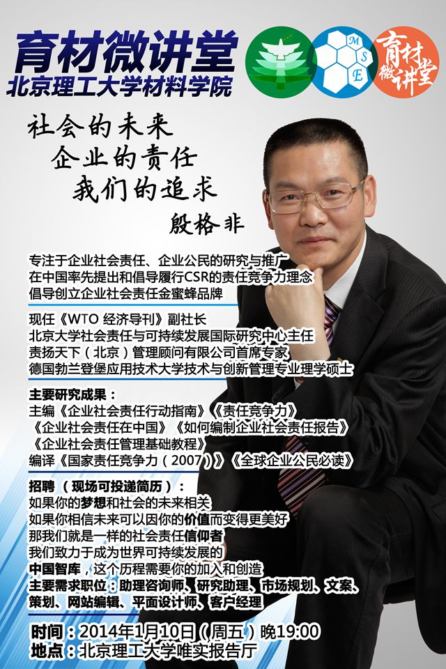 為豐富理工學(xué)子的課余生活,使廣大師生能了解個(gè)人、企業(yè)與社會(huì)之間的關(guān)系。材料學(xué)院“育材微講堂”特邀《WTO經(jīng)濟(jì)導(dǎo)刊》副社長殷格非來分享“社會(huì)的未來、企業(yè)的責(zé)任、我們的追求”。