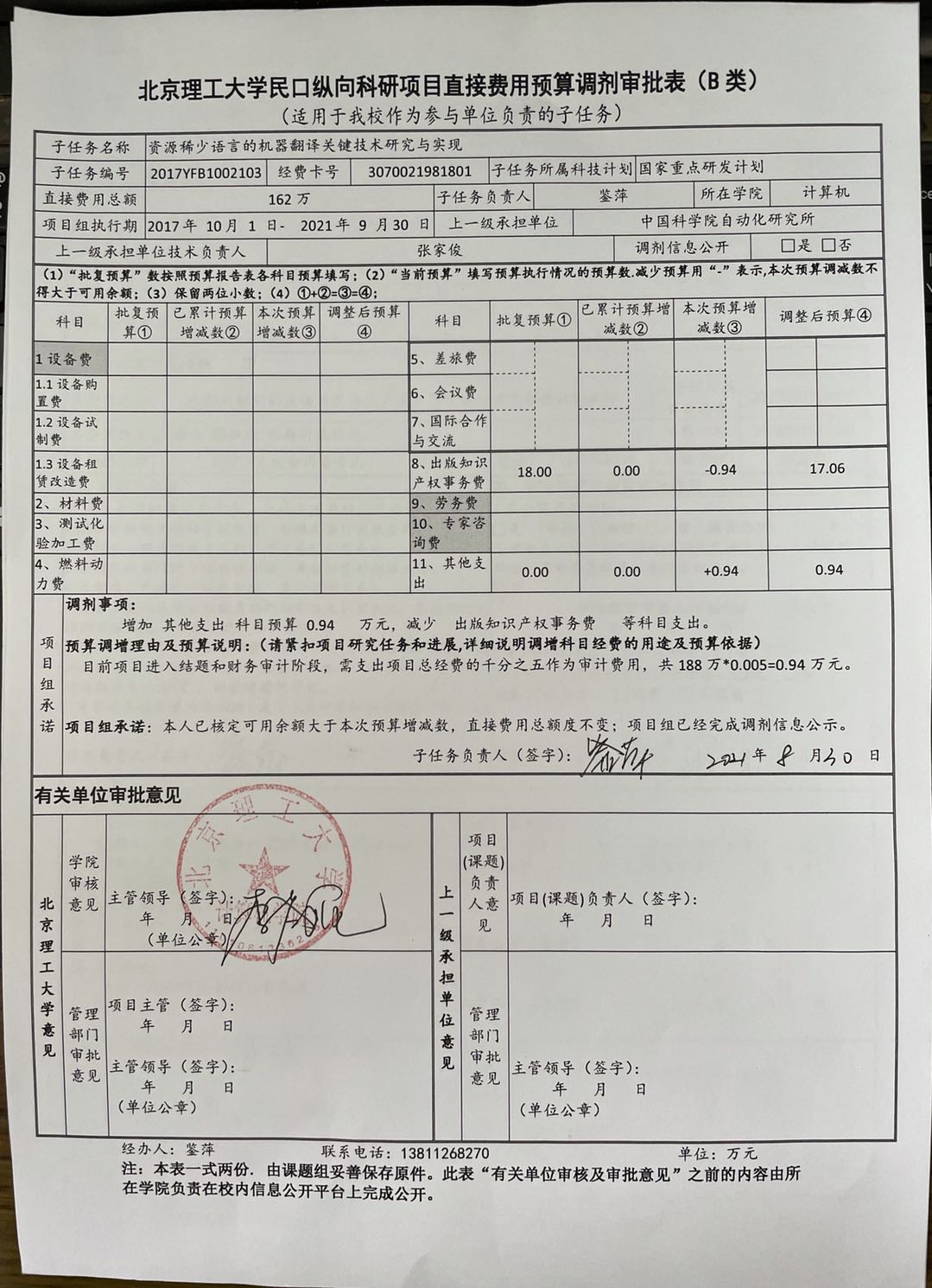 項目2017YFB1002103預算調劑公示