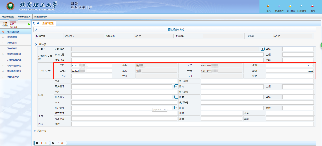 即日起,登錄高級財務管理平臺預約報賬時,在“選擇支付方式”界面直接填入學生學號或勞務派遣人員工號,報銷成功后,款項直接進入其招商銀行卡(該卡為學生專門用于劃扣學費的招行卡、勞務派遣人員專門用于領取工資的招行卡)。