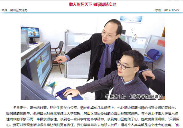 "每個人的能力有限,所以我提倡做有用的東西,做國家、社會需要的東西。"牛振東的想法很"接地氣",因為他一貫秉持腳踏實地的原則。這種做事風格也體現在他履職過程中。"委員參政議政是有要求的,我們要怎樣去調查,怎樣去協商,才能不浪費這個權利?我希望在學術研究上做的東西有用,議政也要議到點子上。我考慮的就是房山切實的需要,尤其涉及教育的事情。"他說。 自 2016 年任房山區政協委員以來,牛振東認真履行委員職責,積極參政議政,參與撰寫了《利用信息化技術推動傳統村落保護方案建議》《構建基于互聯網的房山文化旅游數據融合及服務》等多份調查建議報告,作為主筆人連續三年提交 3 份政協提案。