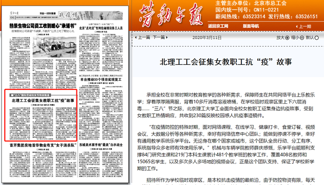 北理工大學(xué)工會表示,征集身邊抗疫故事,目的是通過傳播正能量,“強信心、暖人心”。在各基層工會的動員組織下,校工會共收到230篇來稿,講述了在教學(xué)、科研、管理、后勤保障、醫(yī)療、安保等不同方面的抗疫感人故事,展現(xiàn)出北理工團結(jié)一心、同舟共濟的精神風(fēng)貌。