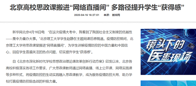 “在這次疫情大考中,我看到了我國(guó)社會(huì)主義制度的優(yōu)越性——集中力量辦大事。”北京理工大學(xué)學(xué)生趙靜在主題網(wǎng)課后感慨道。疫情防控期間,北京理工大學(xué)將思政課堂搬進(jìn)“網(wǎng)絡(luò)直播間”,為學(xué)生講解疫情防控的中國(guó)力量和中國(guó)信心,回應(yīng)學(xué)生普遍關(guān)注的熱點(diǎn)問(wèn)題,切實(shí)提升學(xué)生“獲得感”。