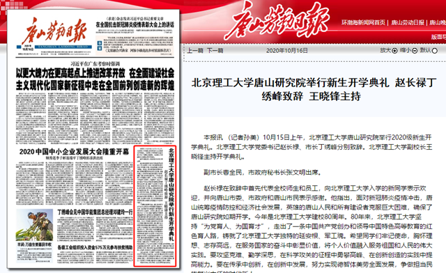 北京理工大學唐山研究院舉行新生開學典禮 趙長祿丁繡峰致辭 王曉鋒主持