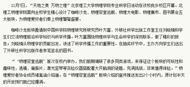 11月7日,“天地之美 萬(wàn)物之理”北京理工大學(xué)物理學(xué)院專(zhuān)業(yè)科學(xué)日活動(dòng)在該校良鄉(xiāng)校區(qū)開(kāi)幕。北理工物理學(xué)院面向全校學(xué)生精心設(shè)計(jì)了咖啡沙龍、物理密室逃脫、物理大電影、物理集市、圖書(shū)展會(huì)五大板塊,為物理愛(ài)好者們奉上物理饕餮盛宴。