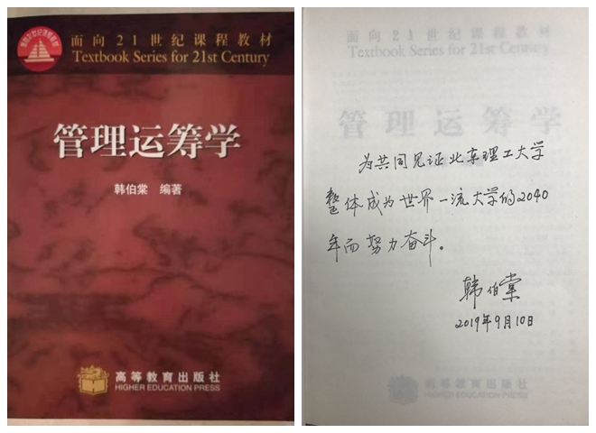 “今天,我將自己編寫的第一版《管理運籌學》教材送給新入職的青年教師,同時也想跟你們做個約定,2040年,讓我們共同見證北理工成為世界一流大學!雖然,我知道這個擔子很重,但是我很有信心,寄希望予你們!當然,我的擔子也很重啊,今年我已經70歲了,到2040年,還有21年哪!但我有信心!我們都有信心!……”在2019年北京理工大學教師榮休儀式上,國家級教學名師韓伯棠教授真摯而動人的寄語,觸動了在場每一位教師的心靈,感動的眼淚與認同的笑聲,一時間充滿了會場,大家再次為“韓式幽默”所折服,也更為這位長者的殷切期待而動容。