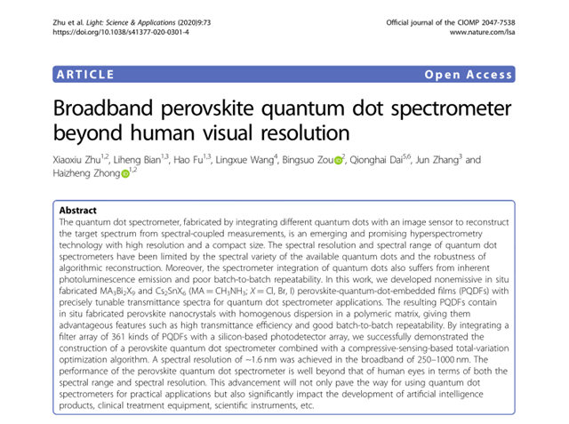 2020年4月,一篇關于“超越人眼的量子點超光譜儀”的研究論文發表于Nature旗下的《Light: Science & Applications》,該研究通過發展鈣鈦礦量子點的原位制備技術,制備出透過光譜可以精細調控的量子點薄膜,實現了一種在光譜范圍、光譜分辨率上超越人眼的新型超光譜儀,全面刷新了2015年麻省理工大學和清華大學在Nature上發表的量子點光譜儀的參數,在人工智能產品和科學儀器領域具有廣闊的應用前景。這一研究成果,就來自剛試運行不到半年的微納量子光子實驗中心。
