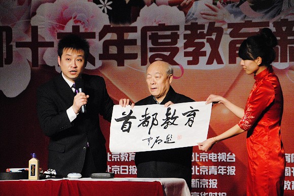 頒獎(jiǎng)典禮上,歐陽中石老先生現(xiàn)場潑墨,書寫了“首都教育”四個(gè)大字。“我這幾個(gè)字寫得很不好,我做得也不是很好,我覺得我很慚愧接受這個(gè)稱號(hào)。”作為最年長的獲獎(jiǎng)?wù)撸瑲W陽中石先生的獲獎(jiǎng)感言最為自謙。