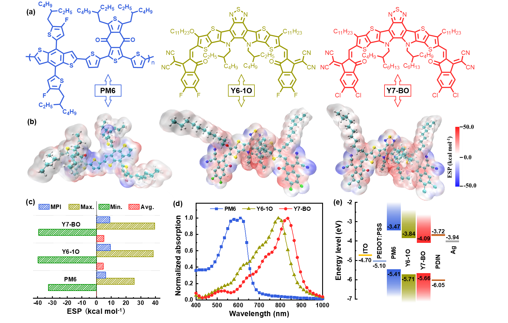 考慮到同源衍生物具有相似的分子結(jié)構(gòu)和良好的兼容性,通過使用同構(gòu)型小分子Y6-1O和Y7-BO作為受體,明星聚合物PM6作為給體來制備高性能三元器件。Y6-1O與Y7-BO具有類似的“BTP”稠環(huán)分子骨架,使得兩個(gè)受體之間具有極好的兼容性,從而有利于精細(xì)調(diào)控三元共混物的形貌以獲得優(yōu)化的短路電流密度和填充因子。另一方面,不同的鹵素取代端基和兩個(gè)受體中不同的不對稱或?qū)ΨQ核心單元能夠提供互補(bǔ)的吸收和可調(diào)節(jié)的能級,這有助于在短路電流密度與開路電壓之間獲得良好的平衡。