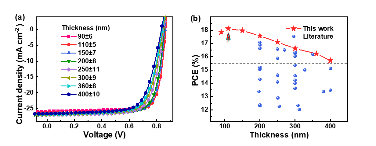 研究結(jié)果顯示,當(dāng)Y6-1O在受體中的含量為10 wt%時(shí),三元器件最優(yōu)效率達(dá)到18.11%,填充因子為79.27%。當(dāng)器件的活性層厚度增加到300 nm或400 nm時(shí),三元器件仍能保持16.61%或15.71%效率,均為目前已報(bào)道同厚度器件效率的最高值。三元器件效率的提升主要?dú)w因于更高效的電荷生成和提取過程,其得益于光子捕獲的增加、能級及形貌的優(yōu)化。該工作結(jié)果表明,將同源非富勒烯受體Y6-1O和Y7-BO相結(jié)合是同時(shí)實(shí)現(xiàn)高效薄膜和厚膜三元有機(jī)太陽能電池的一種有效策略。