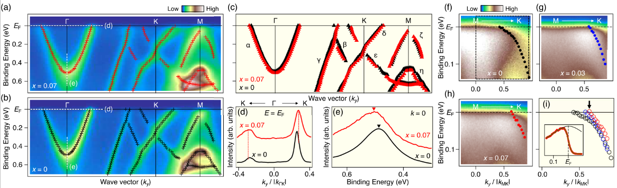 圖5. Cs(V1-xNbx)3Sb5電子能帶結構隨溫度和Nb摻雜濃度的演化