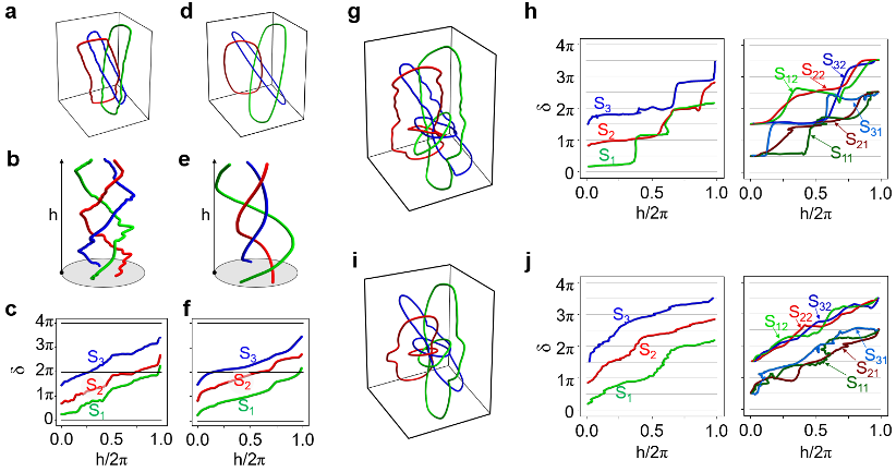首先,研究人員理論設計了具有多拓撲不變量的嵌套式紐結結構。圖1顯示了構建嵌套式紐結的示意圖。其中,圖1a是該嵌套式紐結的辮子表示,它包含了由綠色、紅色和藍色標記的三類不同層級的零點線。為了更清楚地顯示嵌套紐結的層級結構,圖1b展示了起始端面的放大圖。從中我們可以看到,半徑為 r 1的第一代辮子由綠色、紅色和藍色標記的三條第二帶辮子編織而成。同時,三條半徑為 r 2的第二代辮子是由半徑尺寸更小的第三代辮子編織而成。而半徑為 r 3的第三代辮子是由半徑為 r 4的第四代辮子編織而成。通過上述嵌套式的編織方式,最終具有分形幾何結構的嵌套紐結可以被構建出來。如圖1c所示,通過將圖1a中辮子的起始端平面和終點端平面收尾相連,可以實現由四代辮子組成的嵌套紐結結構。由于這一新型的紐結結構具有分形式的嵌套結構,研究者稱其為嵌套紐結(nested knots)。嵌套紐結這一概念的提出,是對紐結理論的拓展。