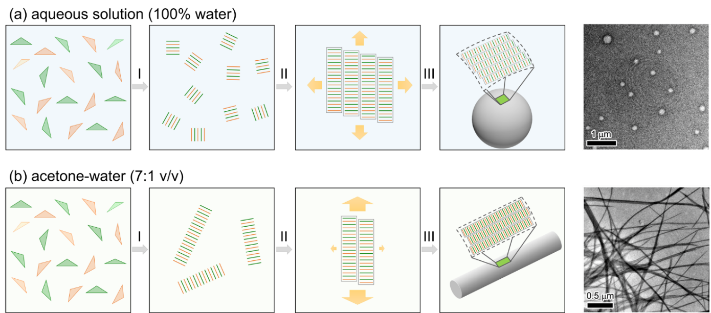 綜合上述研究結果,該研究提出了不同溶劑環境下PtB的分子組裝機理:在水溶液疏水相互作用占主導地位,具有方向性的Pt···Pt與π-π相互作用較弱,PtB采取等鏈生長機制,形成球形的囊泡;在丙酮和水混合溶液中,Pt···Pt與π-π的定向誘導作用占主導,疏水相互作用減弱,傾向于以成核增長機制生長,形成納米纖維。該工作將理論計算與實驗有機結合,為Pt(II)配合物作為超分子構筑基元的功能材料設計和自組裝過程的精確控制提供了理論依據,所開發的力場參數也廣泛適用于其他Pt(II)配合物的組裝過程的模擬。