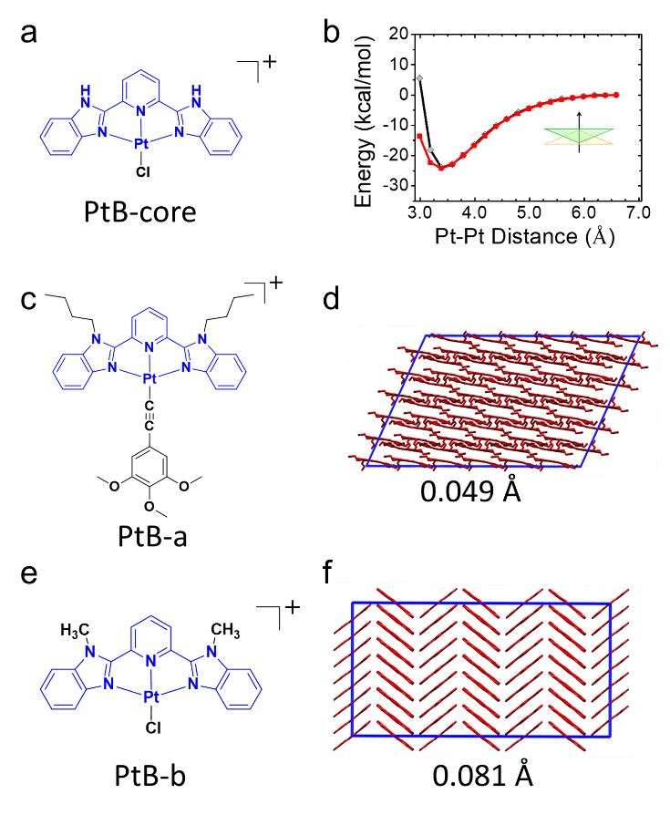 作者進一步開展分子動力學模擬以在微觀層面解釋PtB的分子組裝機理。然而,常用力場庫中沒有Pt(II)的力場參數,給這類體系分子組裝過程的模擬帶來極大的挑戰。為了揭示PtPt相互作用在PtB自組裝過程中的作用,作者開發了一套專門用于Pt(II)配合物分子動力學模擬的力場參數(圖2)。通過PtB-core單體及二聚體進行QM和MM計算,發現當Pt-Pt距離~3.38 ?時,PtB-core分子間相互作用可達-25 kcal·mol-1此時對應的PtPt相互作用強度為-2.52 kcal·mol-1與苯二聚體對應的π-π相互作用相當。所得力場參數能夠很好的重現先前Pt(II)配合物PtB-a和PtB-b的晶體結構數據,進一步證實了力場參數的可靠性。