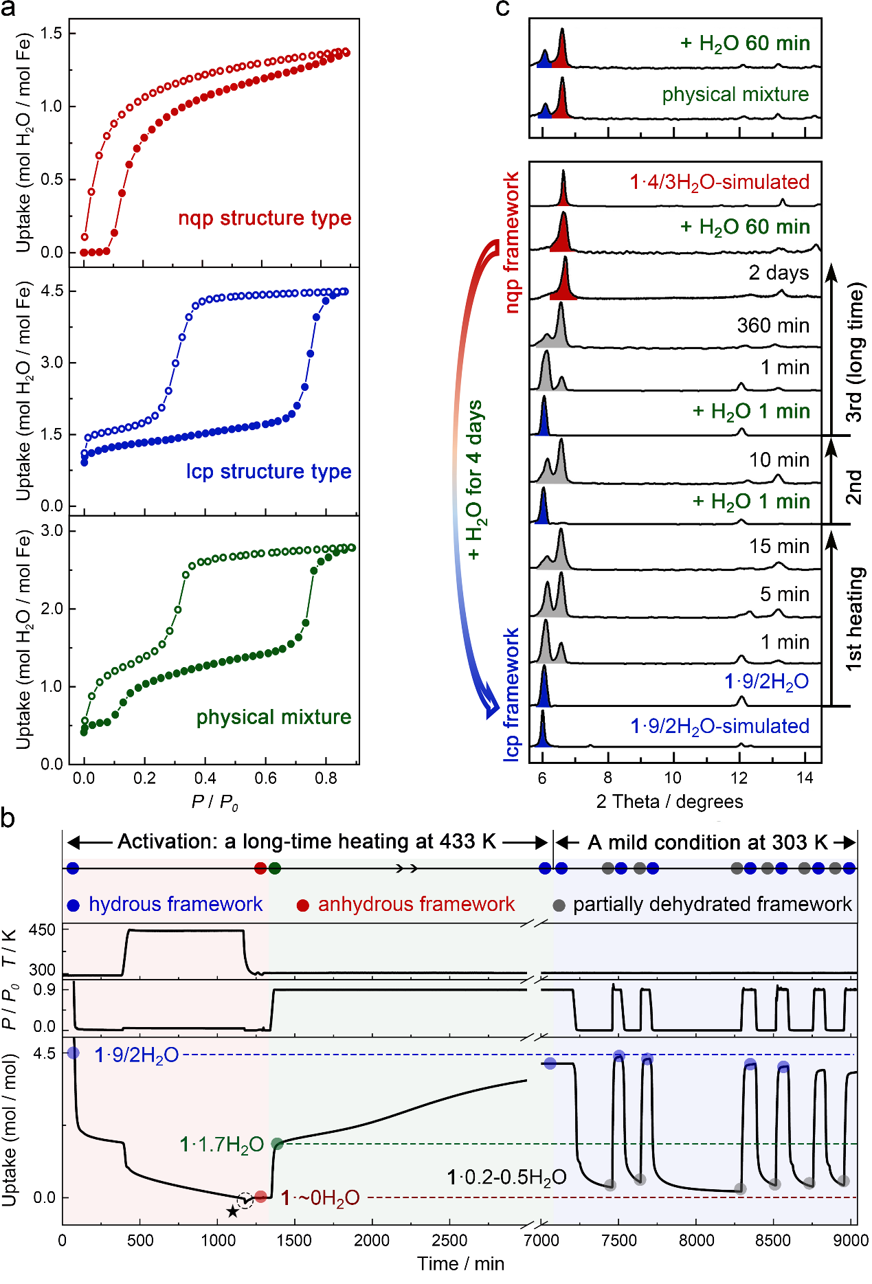 圖3 不同活化條件下的吸附等溫線、連續的水吸脫附循環和PXRD測試