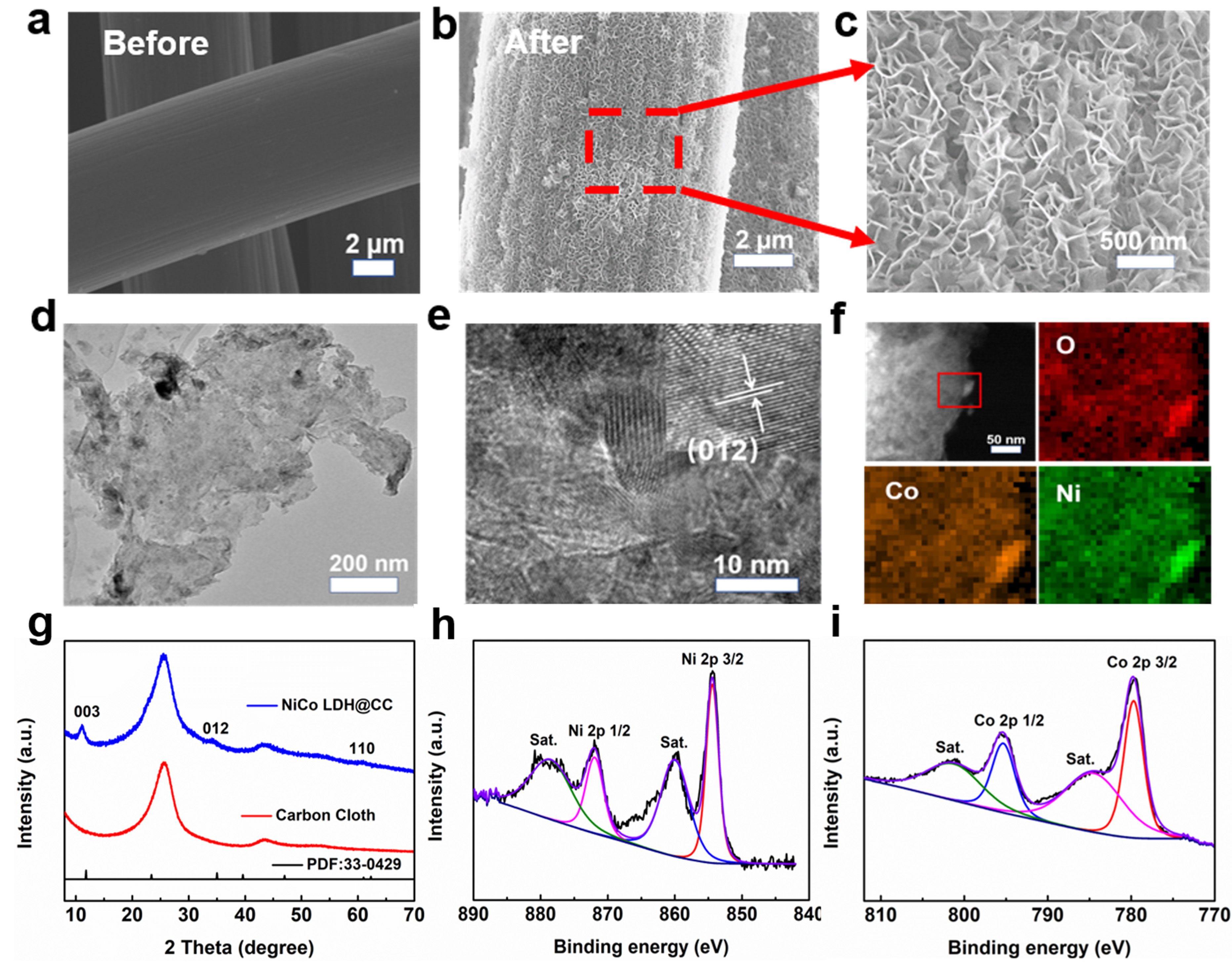 為了研究熱沖擊前后所得樣品的形貌和結構,進行了SEM和TEM表征。經熱沖擊處理約2秒的碳布顯示出粗糙和親水表面,大大避免了復雜和繁瑣的傳統預處理過程。隨著前體溶液的濃度增加到0.25 mol L-1,目標相變成由納米片構成的三維互連網絡(圖2b,c),顯示了促進電解質離子傳輸的潛在可能性。圖2d中的透射電子顯微鏡(TEM)進一步揭示了NiCo LDH的超薄納米片結構,其中晶格距離為0.256nm,屬于NiCo LDH的(012)平面(圖2e),表明成功形成了NiCo-LDH。NiCo-LDH的均勻元素圖譜表明,納米片主要由Co和Ni以及O組成。