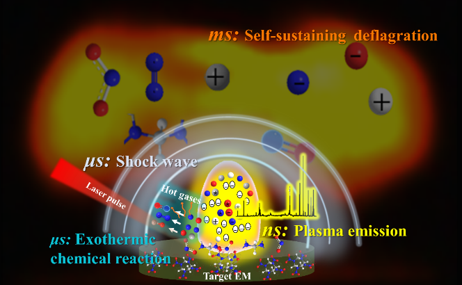 物理機制探索:弄清了激光與含能材料相互作用的微觀物理機制,及超快等離子體過程和微爆動態物理化學過程相關演化機理,證明了激光微爆過程與宏觀爆轟存在的強關聯物理特性,并提出了微爆動力學物理模型,如圖1所示。因此,可以通過對微爆過程的精密物理測量和分析,完成對含能材料爆速、爆壓、生成焓等參數的定量分析以及爆溫的預測。該成果發表在光學頂級期刊Optics Express上(Opt. Express, 2022, 30(4): 4718-4736.)
