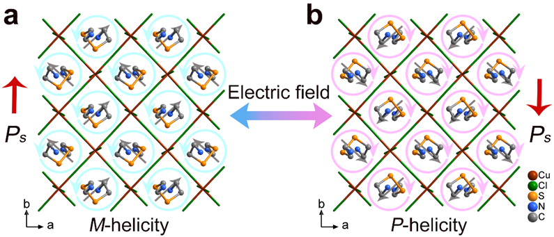 該研究團隊在前期通過分子結構變化調控材料力、電、磁物理性質的基礎上,( Nat. Commun. 2019,  10 , 4805;  CCS Chem.  2021, 2, 2464–2472; Nat. Commun. 2021,  12 , 6908; Nat. Commun. 2021,  13 , 3510),利用胱胺有機陽離子具有顯著結構柔性且在結晶過程易于形成螺旋手性構型的特點,合成胱胺四氯合銅(II)二維鈣鈦礦型晶體。利用胱胺陽離子中間?C?S?S?C?結構片段螺旋取向與分子電偶極矩的結構關聯,通過電場控制該結構片段取向變化,首次實現了電場控制晶態分子的 P -M螺旋手性以及鐵電自發極化的協同反轉。鐵電性質與手性調控的耦合,不僅為外部刺激控制材料手性提供了研究思路,同時有望應用于開發新型手性電子器件。