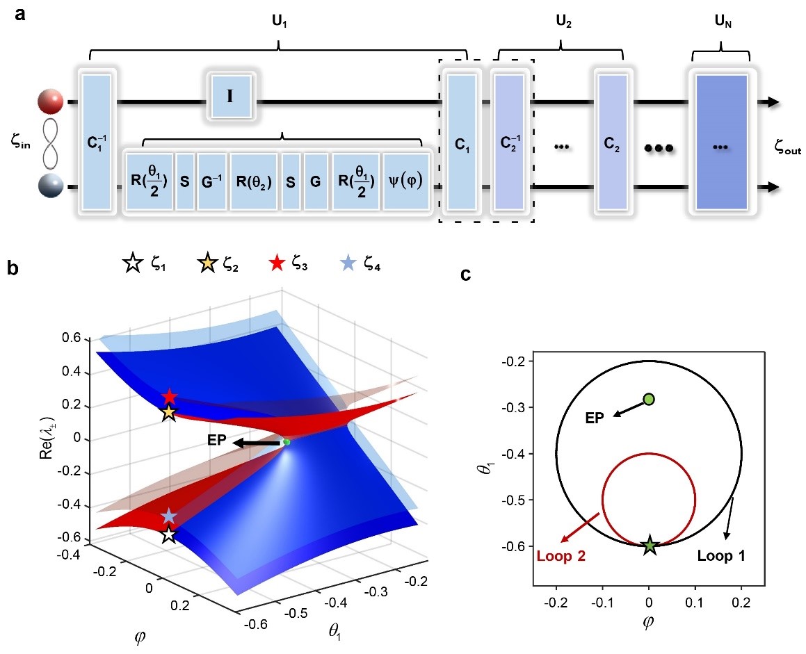在以往的許多研究中,奇異點的動態環繞是用哈密頓量算符來描述的。在該工作中,研究團隊提供了另一種描述此類問題的方法,即利用非厄米量子行走演化算符。如圖 1a 所示,作為輸入態的兩個糾纏粒子(紅色和灰色球體)入射到由多個算符