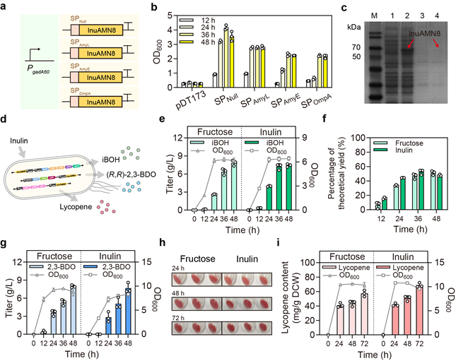 此外,在3L發酵罐中,成功提高了L23R7菌株利用菊粉進行非滅菌發酵生產異丁醇的產量,達到41.0±1.2 g/L,為搖瓶發酵實驗的5.5倍。該產率為0.19g/g菊粉,達到最大理論產率的45.5%。證明了工程改造菌株L23R7具有工業化生產異丁醇的極大潛力(圖4)。