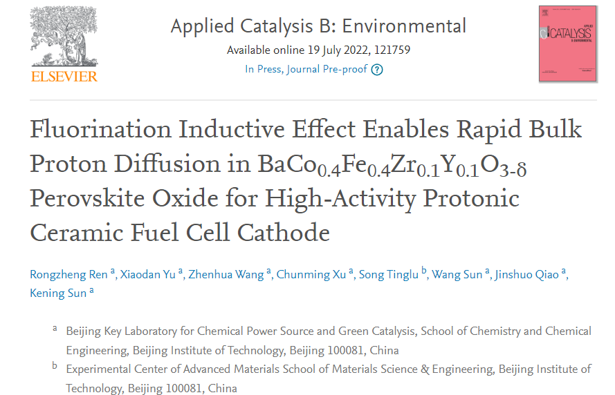 編輯:隆哲源 審核:王振華 閱讀次數(shù):近日,北京理工大學(xué)孫克寧教授團(tuán)隊(duì)在質(zhì)子陶瓷燃料電池氧電極材料設(shè)計(jì)方面取得新進(jìn)展,相關(guān)研究成果以“Fluorination Inductive Effect Enables Rapid Bulk Proton Diffusion in BaCo0.4Fe0.4Zr0.1Y0.1O3-δ Perovskite Oxide for High-Activity Protonic Ceramic Fuel Cell Cathode”為題發(fā)表在國際期刊Applied Catalysis B: Environmental上(IF="24.319),北京理工大學(xué)為唯一通訊單位,化學(xué)與化工學(xué)院孫克寧教授和王振華教授為文章共同通訊作者,博士后任戎征為該論文的第一作者。