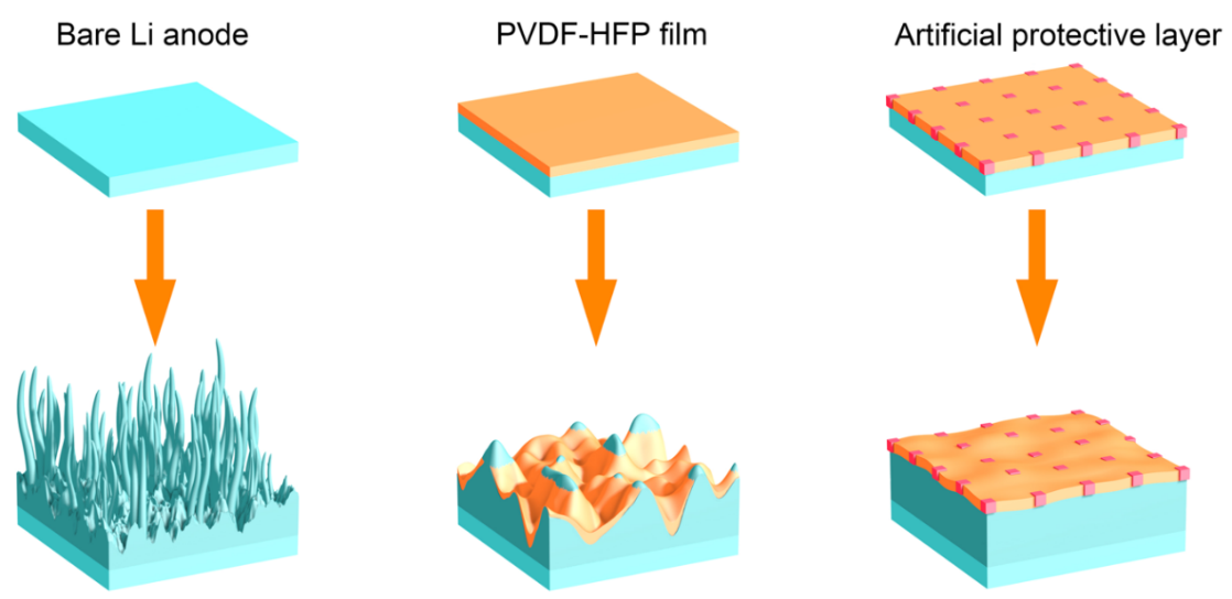 “剛?cè)嵯酀?jì)”的復(fù)合膜對(duì)界面進(jìn)行修飾后,可有效依附于金屬鋰表面,并抑制枝晶生長(zhǎng)的示意圖
