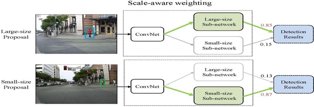 論文針對不同尺度的行人目標存在不同的特征模式、輸入目標尺度變化導致的類內差異會極大增加目標檢測模型的學習難題和挑戰,提出了對不同尺度的目標采用“分而治之”的策略,在共享底層共有特征以保證計算效率的同時,運用專屬網絡分支分別捕獲不同尺度目標的特有高層特征,并進行獨立預測和尺度自適應融合,增強了模型對于輸入尺度變化的魯棒性。該方法簡單易行,可有效應用于真實 復雜場景下的行人檢測。更為重要的是,該方法為提高檢測模型對于輸入變化的魯棒性提供了一種有效的實用性新思路,被廣泛借鑒和應用于計算機視覺領域的其他各種任務中。
