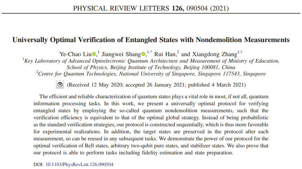 日前,北京理工大學物理學院張向東教授和尚江偉副研究員課題組同新加坡國立大學量子科技研究中心韓睿博士合作,在量子驗證研究領域取得重要進展,提出了基于非破壞測量的新的量子驗證協議。該協議不僅可以達到最優的驗證效率,而且可以實現保真度估計和態制備等其它任務。同時該協議的測量順序是任意的,因而便于實驗實現。相關研究成果發表在國際頂級期刊《物理評論快報》上。