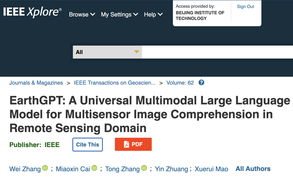 編輯:楊婧 審核:陳棋 閱讀次數(shù):2024年5月,北京理工大學(xué)前沿交叉學(xué)院數(shù)據(jù)流體課題組近日在遙感多模態(tài)大語(yǔ)言模型研究中取得重要進(jìn)展,相關(guān)成果以“EarthGPT: A Universal Multi-modal Large Language Model for Multi-sensor Image Comprehension in Remote Sensing Domain”為題發(fā)表在國(guó)際頂級(jí)期刊《IEEE Transactions on Geoscience and Remote Sensing (TGRS)》上發(fā)表。北京理工大學(xué)為唯一通訊單位,北京理工大學(xué)前沿交叉學(xué)院博士張偉和雷達(dá)技術(shù)研究院博士蔡妙鑫為共同第一作者,毛雪瑞教授為通訊作者。