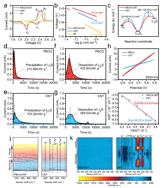 圖3. 多硫化物相關(guān)氧化還原動(dòng)力學(xué)的電化學(xué)表征