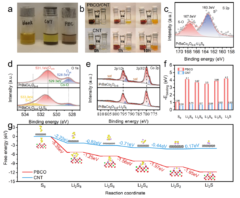 圖4. PBCO與SBCO在多硫化物吸附和氧化還原轉(zhuǎn)化理論計(jì)算和實(shí)驗(yàn)中的比較