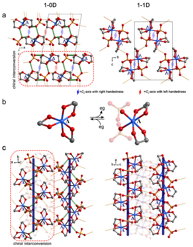 該課題組在前期通過(guò)分子指向變化調(diào)控材料力、磁物理性質(zhì)等相關(guān)工作的研究基礎(chǔ)上( Nat. Chem. , 2014, 6, 1079-1083; Nat. Commum. 2019, 10, 4805-4812; Angew. Chem., Int. Ed. 2017, 56, 717-721),結(jié)合近期通過(guò)客體分子誘導(dǎo)晶格變化的相關(guān)報(bào)道,提出通過(guò)剝離弱螯合配體驅(qū)動(dòng)單晶到單晶轉(zhuǎn)變的研究思路,獲得了首例基于簡(jiǎn)單螯合配體脫離、晶體結(jié)構(gòu)縮合誘導(dǎo)的巨大并且可逆的單晶到單晶轉(zhuǎn)變。通過(guò)乙二醇螯合配體的兩步脫離/吸附,該材料體積可逆伸縮高達(dá)50%,質(zhì)量可逆交換36%,體積與質(zhì)量變化均達(dá)到目前文獻(xiàn)報(bào)道單晶到單晶轉(zhuǎn)變的最大值。同時(shí)螯合配體脫離過(guò)程中,金屬中心相鄰配位點(diǎn)空間釋放,分子手性發(fā)生反轉(zhuǎn),對(duì)應(yīng)單晶材料經(jīng)歷中心對(duì)稱—螺旋手性結(jié)構(gòu)—極性結(jié)構(gòu)的兩步可逆對(duì)稱性變化。該對(duì)稱性變化通過(guò)單晶X-射線衍射、變溫二階非線性光學(xué)以及CD光譜進(jìn)行了詳細(xì)的表征。通過(guò)比照單晶結(jié)構(gòu)對(duì)稱性的轉(zhuǎn)變,作者對(duì)該結(jié)構(gòu)變化的分子運(yùn)動(dòng)機(jī)理進(jìn)行了深入的分析。這種具有類凝膠性質(zhì)的單晶材料為柔性分子基單晶材料的合成提供了新的思路,同時(shí)基于螯合配體脫離驅(qū)動(dòng)的分子手性變化為新型手性配合物的合成提供了可能的途徑。