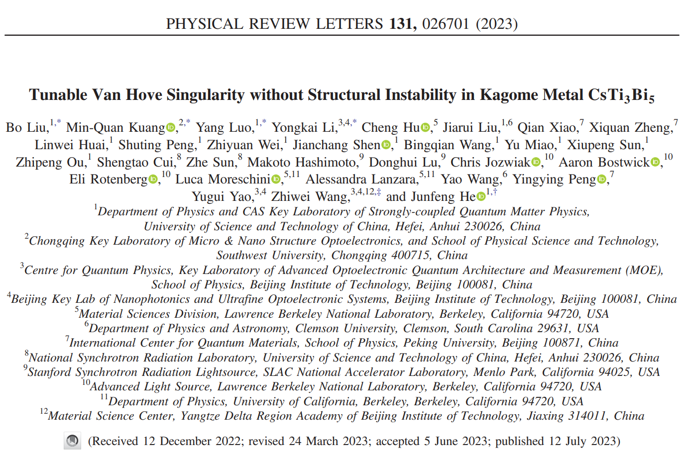 編輯:王莉蓉 審核:陳珂 閱讀次數:近日,北理工物理學院王秩偉特別研究員、姚裕貴教授團隊,與中國科技大學何俊峰教授、西南大學匡泯泉副教授等團隊合作在新型籠目晶格材料CsTi3Bi5中取得進展。他們發現新型準二維籠目材料CsTi3Bi5具有CsV3Sb5相同的結構,是研究電子相關效應、拓撲物態和非常規超導電性等量子現象的一個良好平臺。