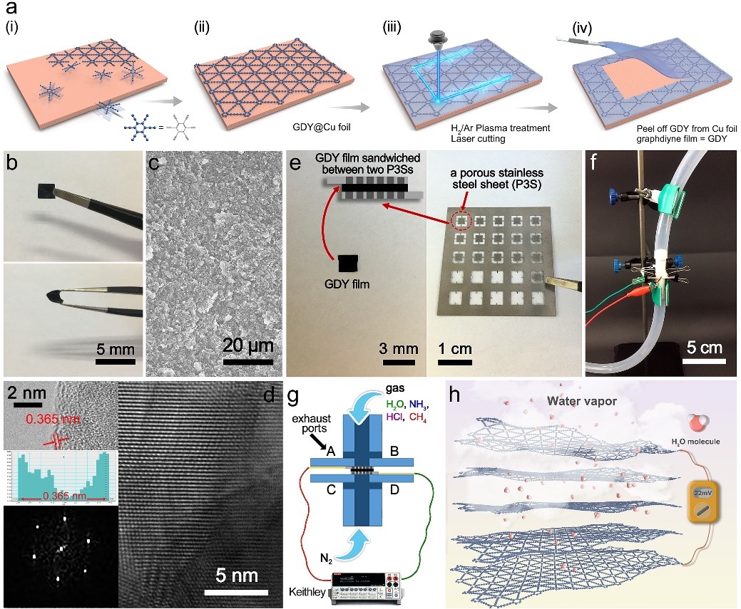 圖1. GDY薄膜的制備和器件特性。(a-d) GDY薄膜的表征。(e-g) GDY薄膜裝置的構成。(h) H2O分子穿過GDY框架結構的示意圖。