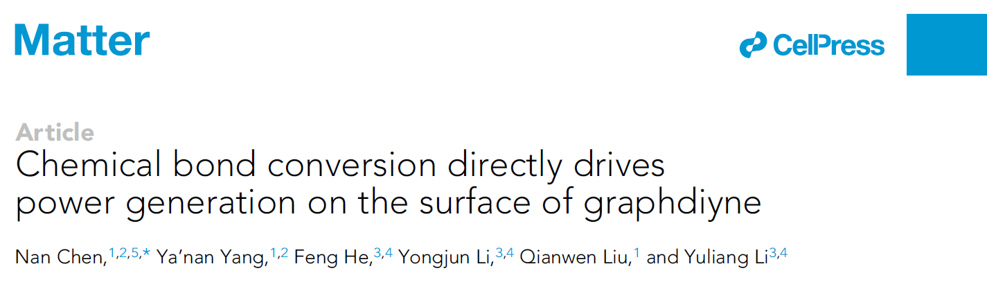 GDY中具有特殊分子結構和化學鍵的產電現象的發現,為能量形態變化的發展開辟了新的方向,促進了新能源的開發和實踐。此外,感應電在未來有潛力用作能量轉換和電能儲存,以及用于快速檢測和識別特定系統中的某些小分子。這一重要的研究成果以“Chemical bond conversion directly drives power generation on the surface of graphdiyne”為題發表在《物質》期刊上( Matter , 2022, DOI: 10.1016/j.matt.2022.06.045)。本工作得到了國家自然科學基金、北京市自然科學基金、北京理工大學創新人才科技資助專項計劃(青拔)等多個項目的資助。文章的第一和通訊作者是陳南副教授,第一單位為北京理工大學。