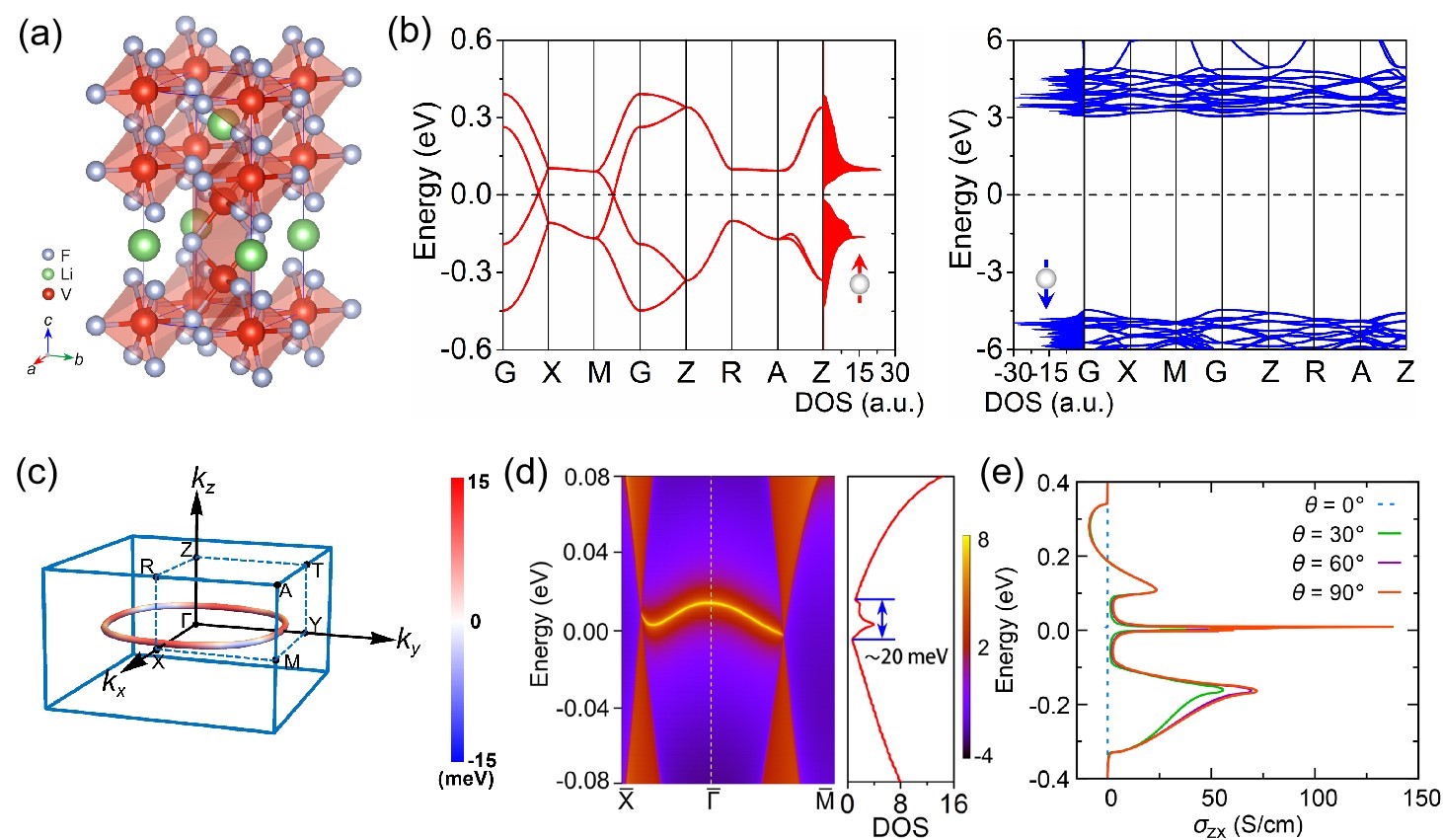 圖2: (a)為LiV2F6的晶體結構;圖(b)為LiV2F6的自旋極化能帶圖和態密度圖;圖(c)為位于 kz ="0的三維節線輪廓圖;圖(d)為LiV2F6的[001]面的表面色散和態密度;圖(e)為在極角 θ = 0°、30°、60°和90°時,本征反常霍爾電導σzx分布圖。