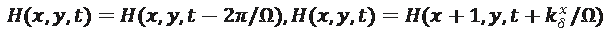 進一步,研究人員考慮(2+1)維拓撲空時晶體,其哈密頓量為,滿足空時平移對稱性。類似于(1+1)維空時晶體,(2+1)維空時晶體也可以用準動量空間中的Floquet哈密頓量來描述。分析發現,ε = ±0.5Ω附近的低能量有效哈密頓量沒有時間反演、粒子空穴和手征對稱性,可以用拓撲不變量來表征。圖2a展示了系統在開邊界條件下的準能譜分布,其中顏色表示對應本征態的邊界局域強度。可以清晰看到,ε = ±0.5Ω附近存在拓撲空時邊界態(圖2c)。需要強調的是,ε = 0.5Ω和-0.5Ω附近的拓撲邊界態是由不同能量扇區單軌道Floquet能帶耦合得到,相鄰能量區間的拓撲空時邊界態色散滿足ε → ε+Ω和kx → kx + kδx(圖2b)。圖2d進一步展現了(2+1)維拓撲空時晶體的相圖,拓撲相變發生在kδx和kδy的絕對值接近π的區域。