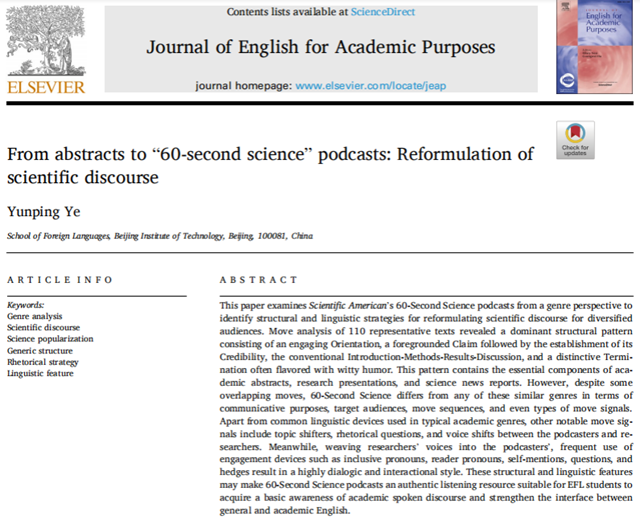 近日,北京理工大學(xué)外國(guó)語(yǔ)學(xué)院葉云屏教授關(guān)于科學(xué)話語(yǔ)再建構(gòu)的原創(chuàng)研究成果...