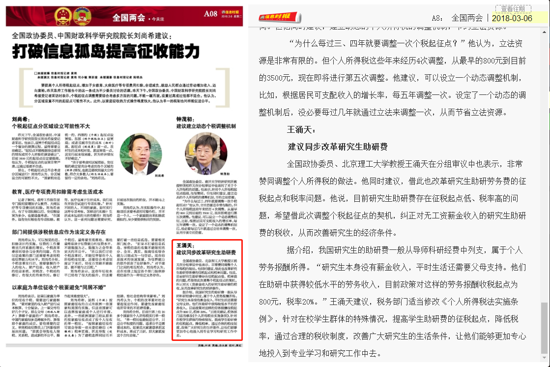 全國政協(xié)委員、北京理工大學(xué)光電學(xué)院教授王涌天委員作為一名老委員,去年十二屆政協(xié)五次會(huì)議上,就遞交了一份“關(guān)于減輕研究生助研勞務(wù)費(fèi)稅負(fù)的提案”,他認(rèn)為作為導(dǎo)師,發(fā)給學(xué)生助研費(fèi),既為了幫助研究生克服生活困難,同時(shí)也是對他們付出勞動(dòng)的尊重,獎(jiǎng)勵(lì)他們在科學(xué)研究中做出的貢獻(xiàn)。但是我國現(xiàn)行的勞務(wù)費(fèi)征稅辦法從800元到20000元,都征收20%的稅費(fèi),很不合理。今年當(dāng)聽到總理所做的政府工作報(bào)告中提出“個(gè)人所得稅起征點(diǎn)將提升”這句話,王涌天委員心中感到一絲欣慰,王涌天表示非常希望能夠借此契機(jī)糾正對無工資薪金收入的研究生人群的不合理的收稅現(xiàn)象,改善廣大研究生的生活條件,使他們能夠更加專心地投入到專業(yè)學(xué)習(xí)和研究工作中去。他認(rèn)為作為老師,要關(guān)心學(xué)生的切身利益,要幫他們呼吁一些事情;作為政協(xié)委員,看到社會(huì)經(jīng)濟(jì)生活中不合理的事情,我也要發(fā)聲呼吁。