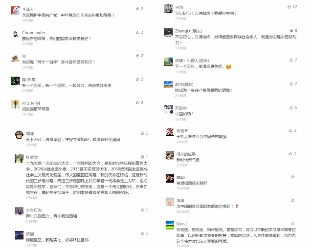 在十九大勝利開幕的熱烈氛圍中,師生們激情滿懷,紛紛加入學(xué)院官方公眾號北理工自動化中的“喜迎十九大,說出你的心聲”活動中,僅僅三個小時,公眾號就收到了數(shù)百條師生們的留言: