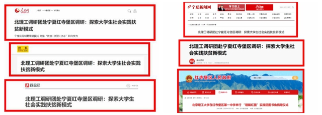 編輯:劉曉雪 審核:金海波、劉曉俏 閱讀次數:2020年10月,人民網、今日頭條、新浪微博、搜狐、網易號、紅寺堡視線、紅寺堡區人民政府網站、寧夏新聞網等多家媒體紛紛以《北理工調研團赴寧夏紅寺堡區調研:探索大學生社會扶貧新模式》《大學生如何扶貧?北理工調研團在寧夏紅寺堡區找到答案》等為題報道北京理工大學材料學院與寧夏紅寺堡第一中學的共建活動,寧夏日報、吳忠日報、紅寺堡電視臺對活動進行了全程跟蹤報道。此次共建共學主題團日活動是北理工“理展紅圖”社會實踐團赴寧夏紅寺堡開展動態扶貧調研并長期扶貧工作的成果。