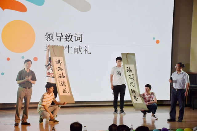 王偉致辭。他囑咐大家要用家國情懷為“前行之路”指明方向,用堅(jiān)忍不拔為“前行之路”披荊斬棘,用團(tuán)結(jié)協(xié)作為“前行之路”匯聚力量。同學(xué)們認(rèn)真聆聽了王偉的諄諄教誨。同時(shí),畢業(yè)生代表為學(xué)院贈(zèng)送了一副對(duì)聯(lián)。