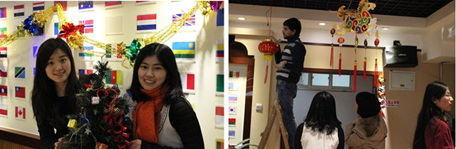 1月10日一大早,學生們就來到了留學生中心活動室,和老師們一起掛燈籠、貼窗花、貼對聯……按照中國的新年習俗把活動室布置一新。此次迎新年活動主要包括剪窗花、猜燈謎、中國書法和包餃子四個項目,來自巴基斯坦、盧旺達、德國、美國等幾十個國家的外國留學生,熱情洋溢地參與到各項活動中,大家都沉浸在一片熱鬧、喜慶的節日氣氛中。