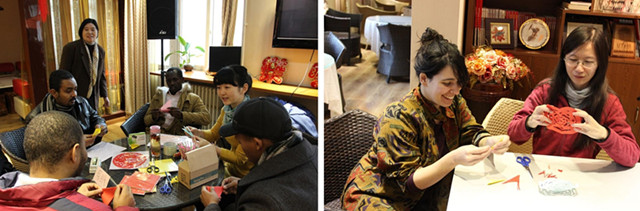 剪窗花是中國百姓喜迎新春的一項傳統,外國留學生們看著漢語老師們演示剪紙的做法,也跟著一步步疊、畫、剪起來,一件件美麗而意想不到的作品呈現在大家面前。同學們把自己的作品一張張貼到窗戶上,頓時間,活動室的年味更足了。
